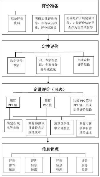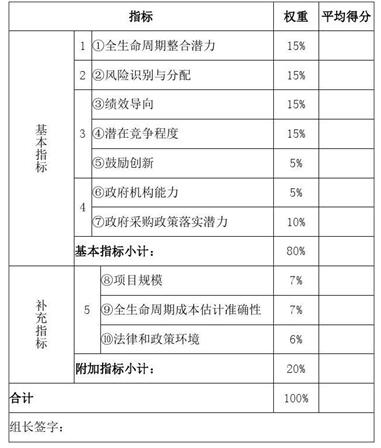 (二)评价方法。主要包括定性评价程序、指标及权重、评分标准、评分结果、专家组意见以及定量评价的PSC值、PPP值的测算依据、测算过程和结果等。