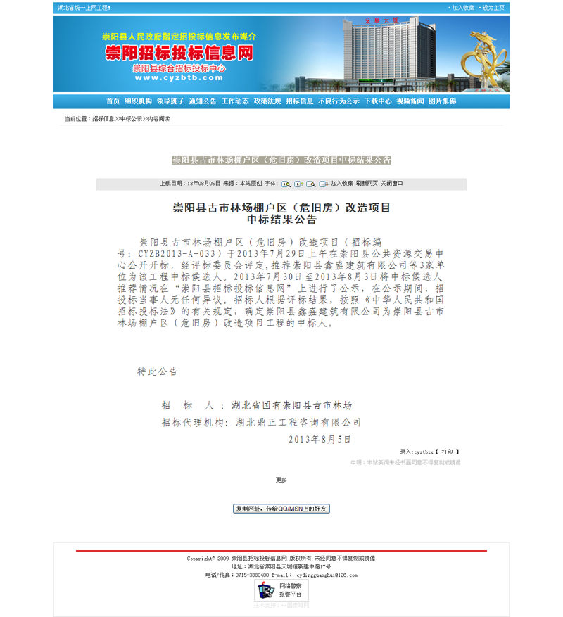 崇阳县古市林场棚户区(危旧房)改造项目中标结果公告