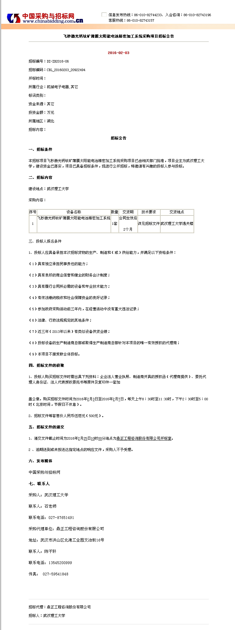 飞秒激光钙钛矿薄膜太阳能电池精密加工系统采购项目招标公告