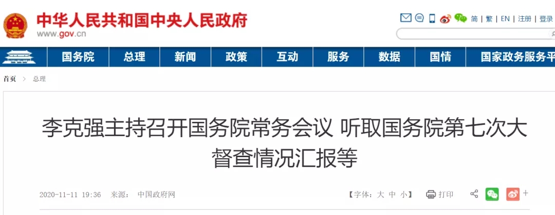 国务院总理李克强11月11日主持召开国务院常务会议,听取国务院第七次大督查情况汇报,确保政策落实,更好发挥促进经济稳定恢复的重要作用;决定在浦东新区开展市场准入“一业一证”试点,在全国大幅压减建设工程企业和测绘资质并加强监管,更大激发市场活力,为扩大消费和有效投资创造条件。
