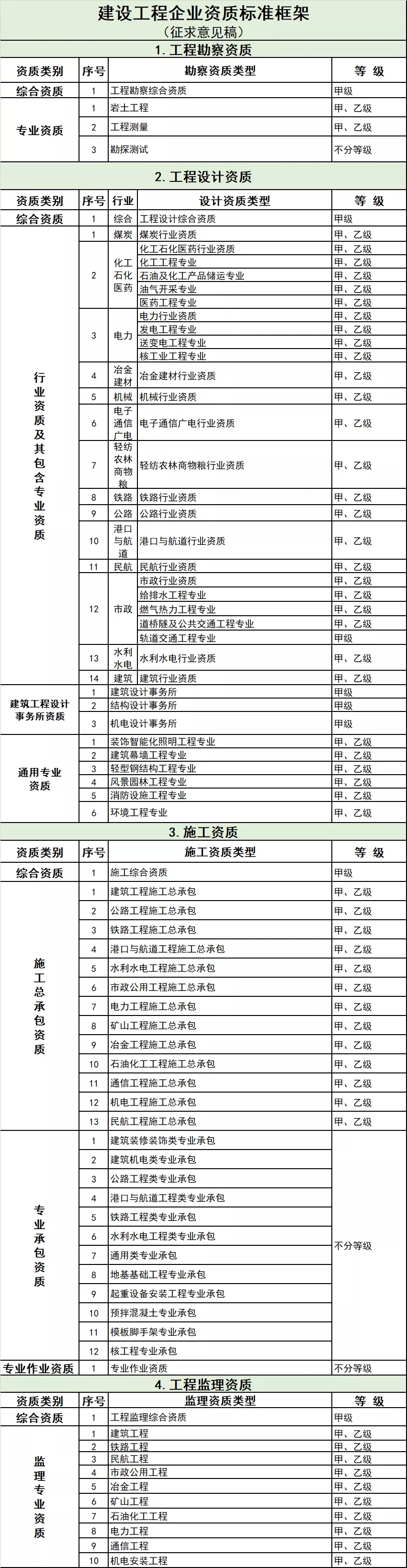 附:《建设工程企业资质标准框架(征求意见稿)》