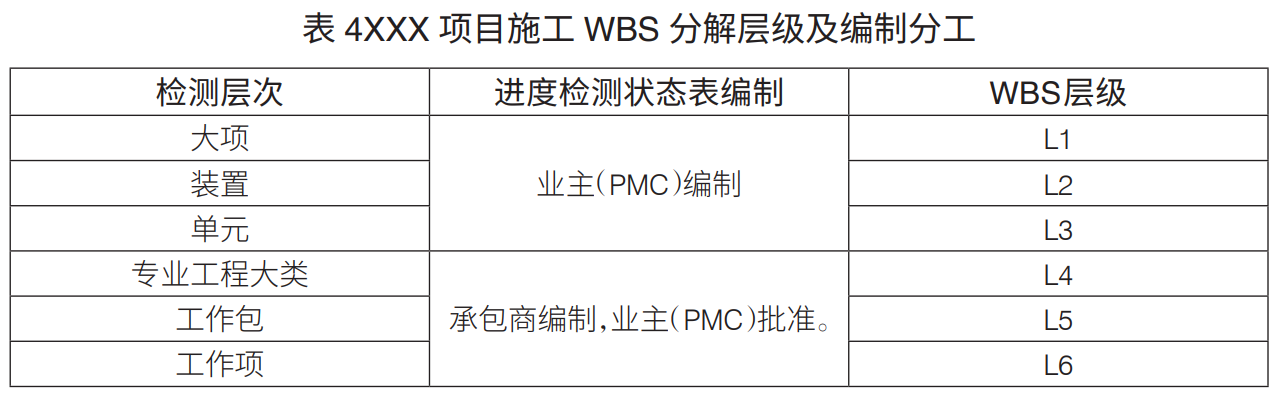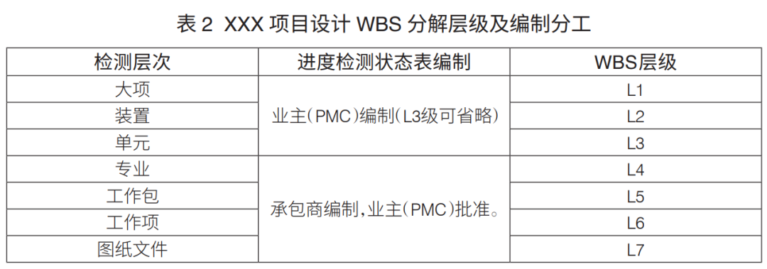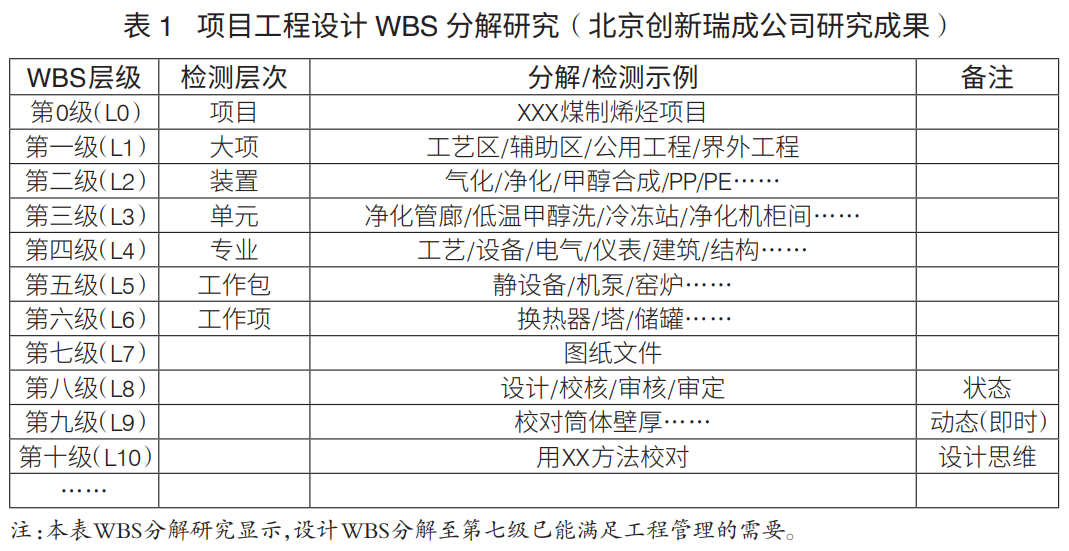 工程项目WBS分解层级:工程项目WBS分解主要是进行设计、采购、施工WBS分解。通常,设计WBS分解至七级、采购WBS分解至六级、施工WBS分解至六级,可满足工程管理要求(表1)。