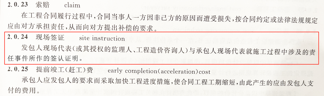 依据《建设工程工程量清单计价规范》(GB50500-2013)第2.0.24条对现场签证的定义:“发包人现场代表与承包人现场代表就施工过程中涉及的责任事件所作的签认证明。”