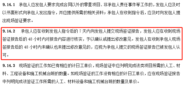 此外,第9.14.2条中,“......发包人在收到承包人现场签报告后的48小时内未确认也未提出修改意见的,应视为承包人提交的现场签证报告已被发包人认可。”即,从时限来讲,“48小时”亦非能够满足发包方充分询价并与承包方定价的时长。
