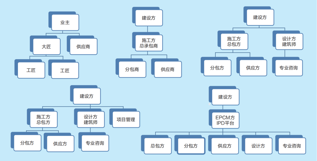 建筑物的设计、建造全过程,不同于一般的工业产品的生产,而是采用项目制、订制生产、现场施工建造,建筑工程的规模性和外部性带来多方参与设计、建造的全过程。我们将建筑物设计、建造过程中各个参建方的关系,即建筑物生产过程中的生产组织方式,称之为工程组织模式。工程组织模式建设方是根据建筑工程的特点、以项目利益最大化为原则选取最优的工程合同模式,也就是工程的合同交付模式。