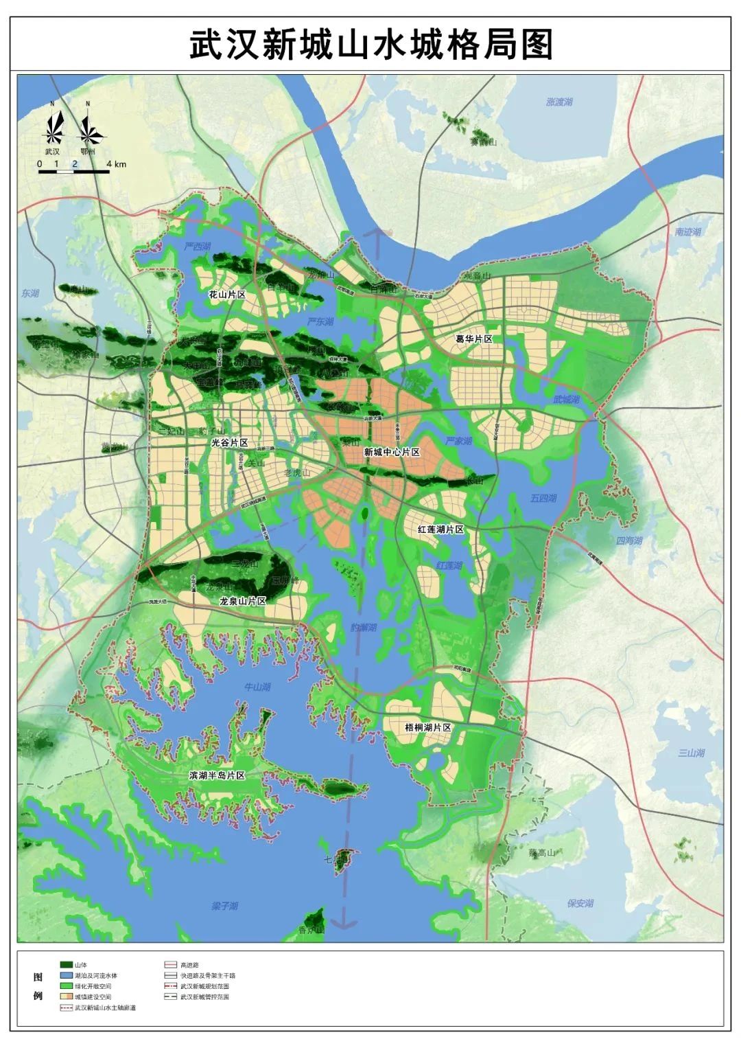 按照“山水城、家园城、智慧城”三大目标,构建山湖相映、组团发展的空间结构,划分新城中心片区、光谷片区、葛华片区、花山片区、龙泉山片区、红莲湖片区、梧桐湖片区、滨湖半岛片区共8大片区,形成产城融合、功能复合的空间布局。
