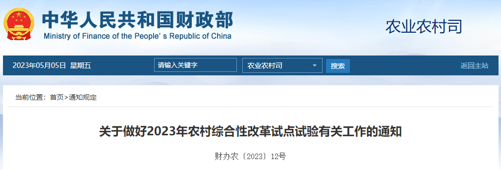 为深入贯彻党的二十大精神,认真落实2023年中央一号文件“深化农村改革”、“深入推进农村综合改革试点示范”的任务要求和中共中央、国务院印发的《数字中国建设整体布局规划》部署,在总结前期试点经验的基础上,2023年中央财政继续支持实施并启动新的农村综合性改革试点试验(以下简称试点)。现就有关工作通知如下。