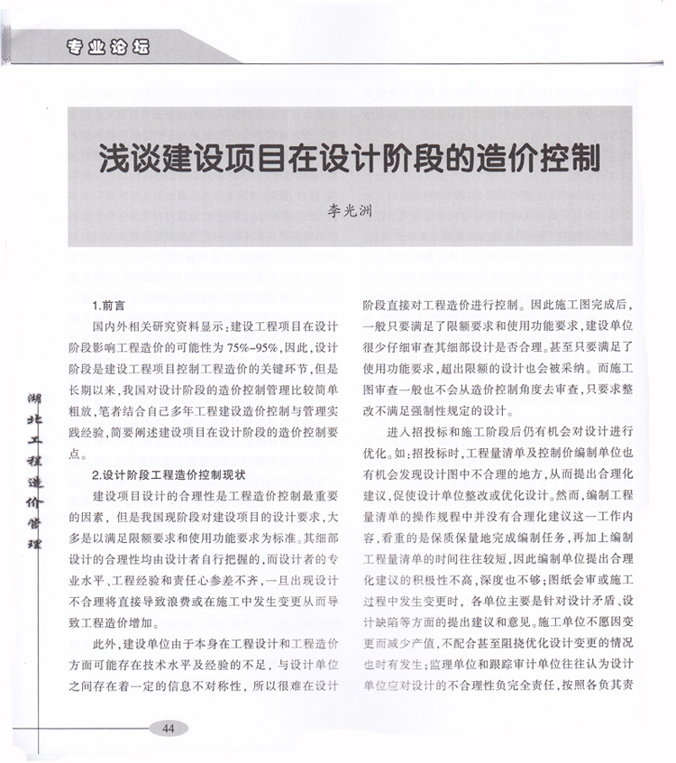 我司李光洲同志论文《浅谈建设项目在设计阶段的造价控制》发表
