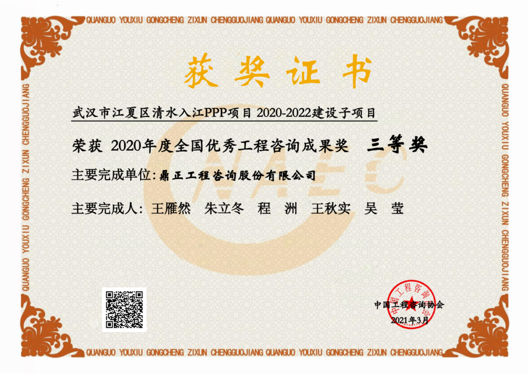 每两年评选一次,2018-2019年,我司大悟县宣化店旅游名镇建设PPP项目首获“全国优秀工程咨询成果奖”荣誉;2020-2021年,我司武汉市江夏区清水入江PPP项目再获该奖;2022-2023年,我司东数西算贵安新区算力立业集群配套项目第三次获得此殊荣。