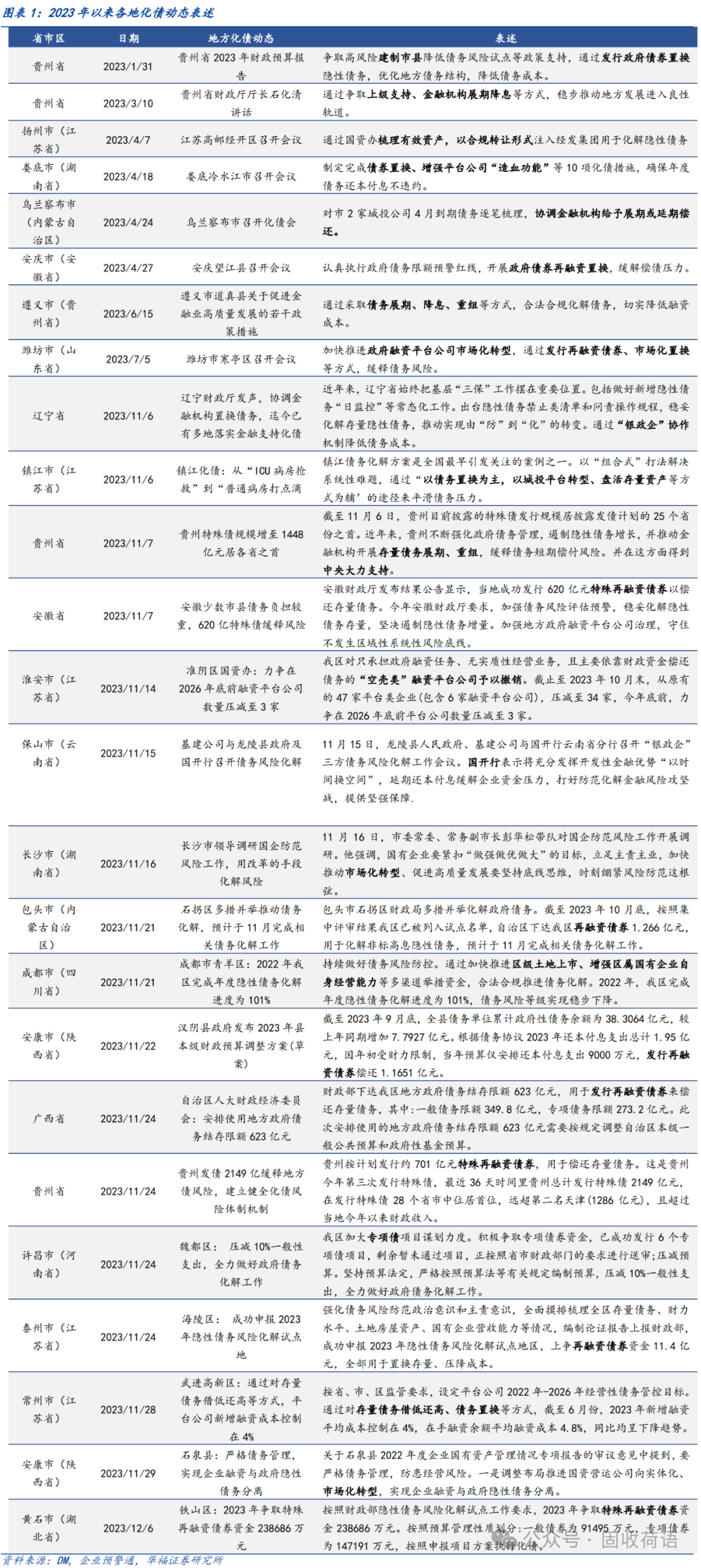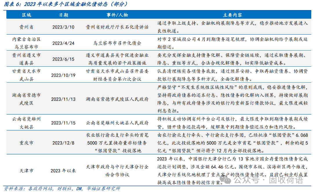 财政部《地方全口径债务清查统计填报说明》中提出六种常见的债务化解举措,具体为(1)安排财政资金偿还;(2)出让政府股权以及经营性国有资产权益偿还;(3)利用项目结转资金、经营收入偿还;(4)合规转化为企业经营性债务;(5)通过借新还旧、展期等方式偿还;(6)采取破产重整或清算方式化解。同时,根据各地化债动态表述,各地根据自身情况,积极探索了金融机构贷款置换、城投平台整合或转型、特殊再融资债置换、设立化债基金等方式推动化债进程。