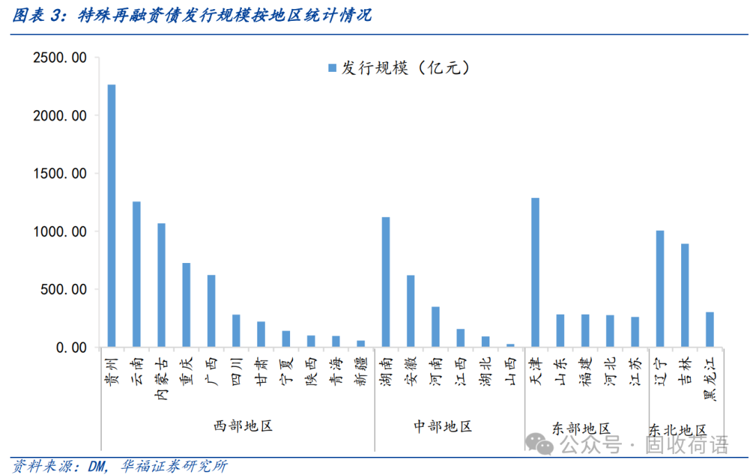发行集中在西部地区。相较于东、中部地区,西部地区整体综合财力较弱,债务负担较重,因此在上级支持方面存在较大优势。