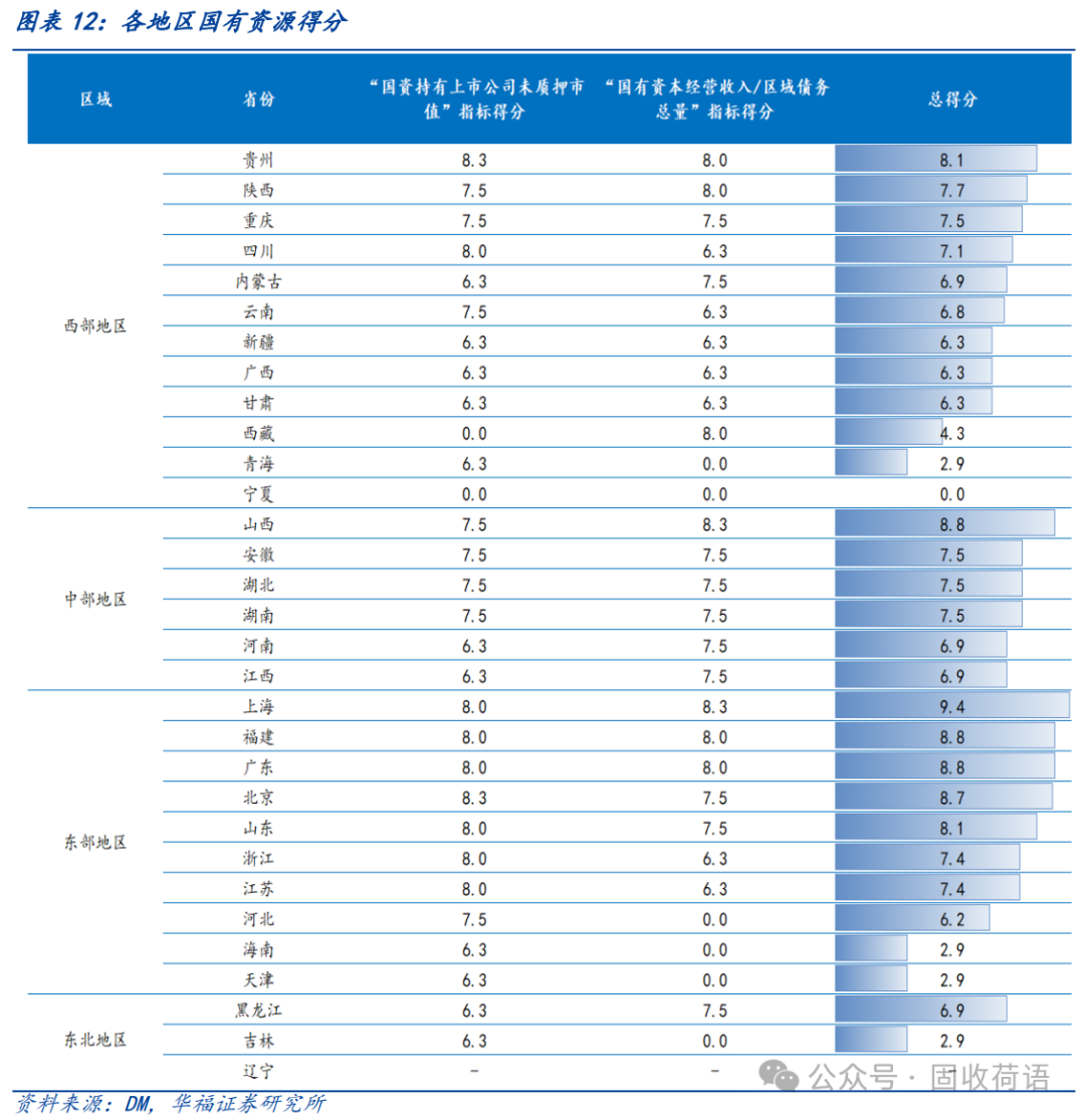 (2)中部地区的化债资源整体较一般,可结合自身优势充分利用各类资源缓解债务风险。例如,安徽可以利用其丰富的上市国企资源进行化债。