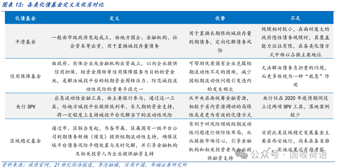 设立“化债基金”作为地方政府有效的管控城投债务风险的手段,被各地广泛运用,包括平滑基金、信用保障基金、央行SPV等。基金资金主要来源于省内/市内,调动的是区域内的金融资源,但规模相对有限;SPV在投放贷款的同时或要求抵押品,因此国有资源更为丰富的区域预计将获得更大的支持。