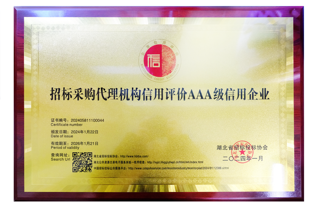 近日,鼎正凭借诚信的经营理念、良好的企业信誉和优质的服务质量,荣获由湖北省招标投标协会认定的最高等级“招标采购代理机构信用评价AAA级信用企业”称号。