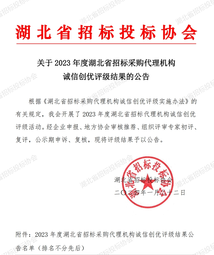 此次评选是湖北省招投标协会根据《关于建立完善守信联合激励和失信联合惩戒制度加快推进社会诚信建设的指导意见》要求和《政府采购招标代理机构管理办法》及相关法律法规规定,按照“自愿、公开、公平、公正、非营利”原则,在会员单位内开展“湖北省招标投标行业招标采购代理机构诚信创优评级”活动。