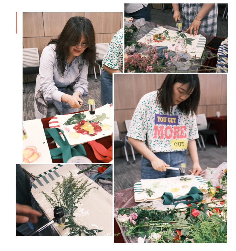 活动现场充满了欢声笑语,大家纷纷使出“洪荒之力”,咚咚咚…….伴随着细碎的敲击声和花草香,一幅幅色彩斑斓的植物图案跃然纸上。
