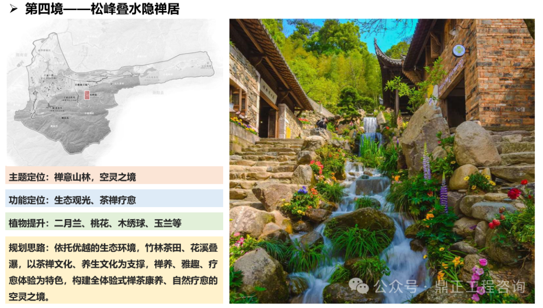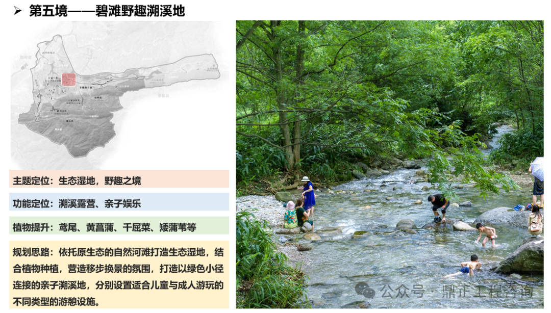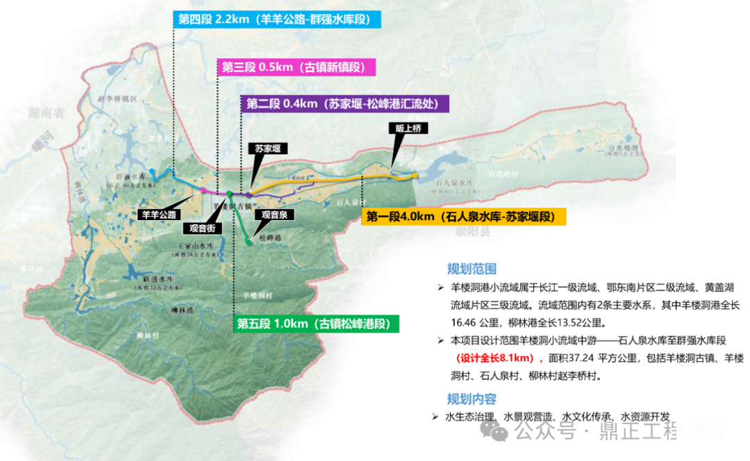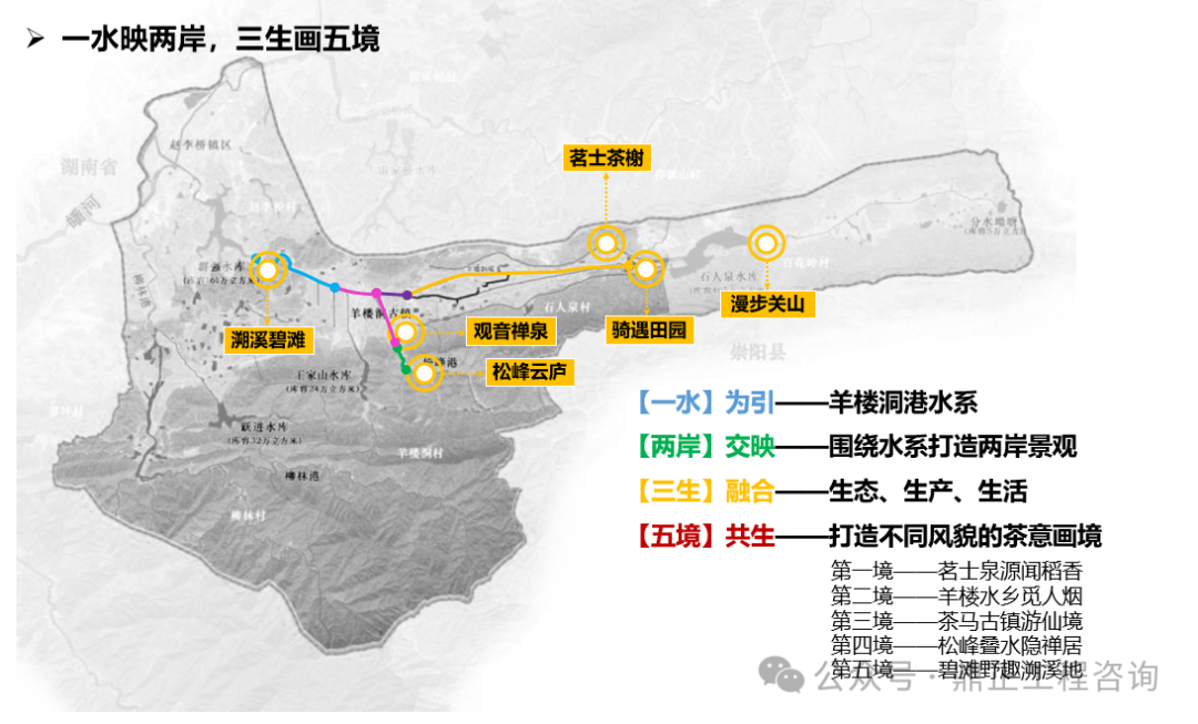 一水为引,指出治理对象,即羊楼洞港小流域;两岸交映,指出治理范围,即包括上下游、左右岸、堤内外;三生融合,指出治理路径,即走好生产、生活、生态协调发展之路;五境共生,即为五个治理分区,通过分段体现差异化分区的理念,以线带面也利于实施过程中分期分段逐步推进。每个分区都有具体的功能定位、治理目标、治理标准,因此不同分区名称就是该区治理特色的高度凝练,既要体现水系的区位,如“茗士泉源”对应相公泉,“茶马古镇”对应羊楼洞古镇,“松峰”对应松峰山;也要体现水系的形态,如“泉”、“溪”、“叠水”等;还要体现水系的功能,如“稻香”对应田园塘渠,“水乡”对应生活河道,“碧滩”对应生态湿地等。