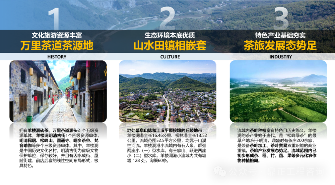 以本项目为例,羊楼洞港小流域地处幕阜山脉和江汉平原接壤的丘陵地带,流域内有羊楼洞港、柳林港两条水系,整体呈现山、水、田、镇相嵌套的格局;流域内拥有明清时期国际茶叶贸易名镇——羊楼洞古镇,这里是欧亚万里茶道的源头;流域内茶叶种植特色历史悠久,茶旅产业发展态势正足,并且已初步形成茶、稻、竹、芍、果等多元化农作物种植格局。