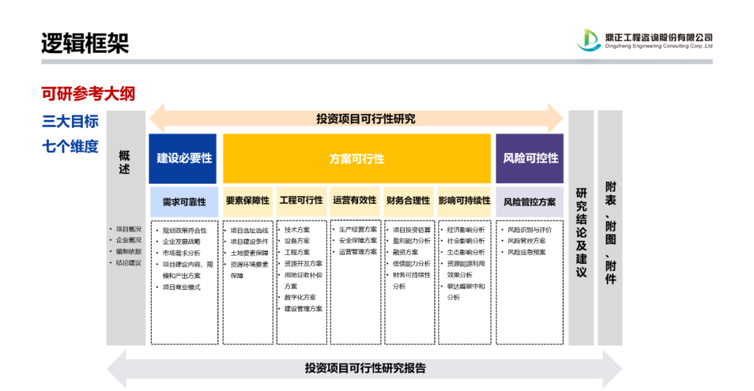 《可行性研究报告编制大纲(2023年版)》的颁布实施,对于我国新时代投资项目科学决策、推动实现高质量投资具有里程碑意义,鼎正作为一家综合性咨询企业,多年来深度服务湖北省及下属多个县市区的经济建设,在全过程工程咨询、投融资咨询、专项债咨询、国债咨询、PPP咨询等,积累了良好的理论基础与品牌口碑,并从咨询实践中摸索出一套“向前、向后、向绿色”的高质量咨询产品线,能够提供高质量全方位的咨询服务。