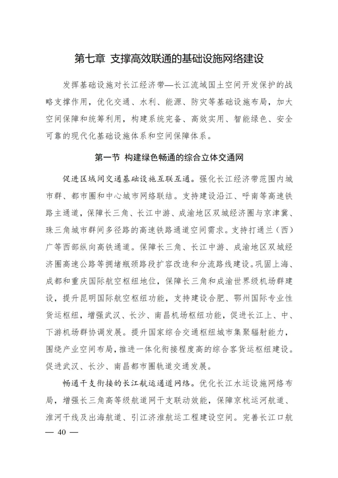 强化长江经济带范围内城市群、都市圈和中心城市网络联结。支持建设沿江、呼南等高速铁路主通道,保障长三角、长江中游、成渝地区双城经济圈与京津冀、珠三角城市群间多径路的高速铁路通道空间需求。