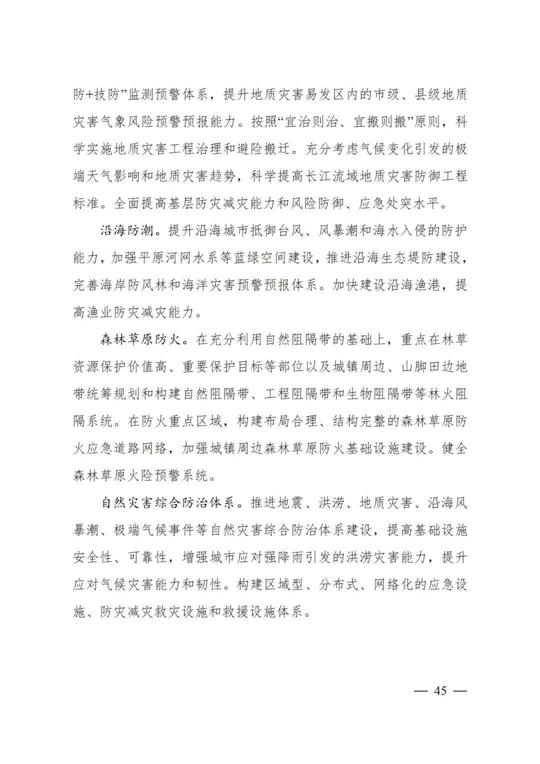 推进地震、洪涝、地质灾害、沿海风暴潮、极端气候事件等自然灾害综合防治体系建设,提高基础设施安全性、可靠性,增强城市应对强降雨引发的洪涝灾害能力,提升应对气候灾害能力和韧性。构建区域型、分布式、网络化的应急设施、防灾减灾救灾设施和救援设施体系。