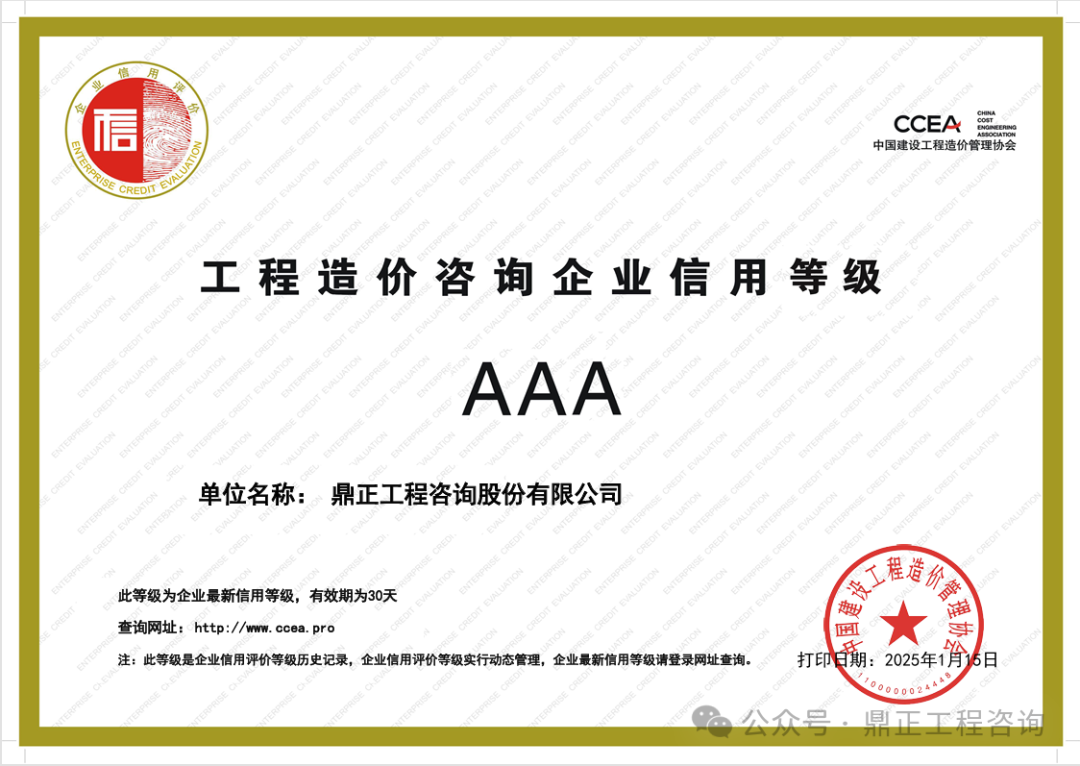 近日,中国工程咨询协会发布了2024年度工程咨询单位信用评价公告,鼎正凭借优异的诚信建设和信用管理能力,荣获“AAA级信用等级”评价。