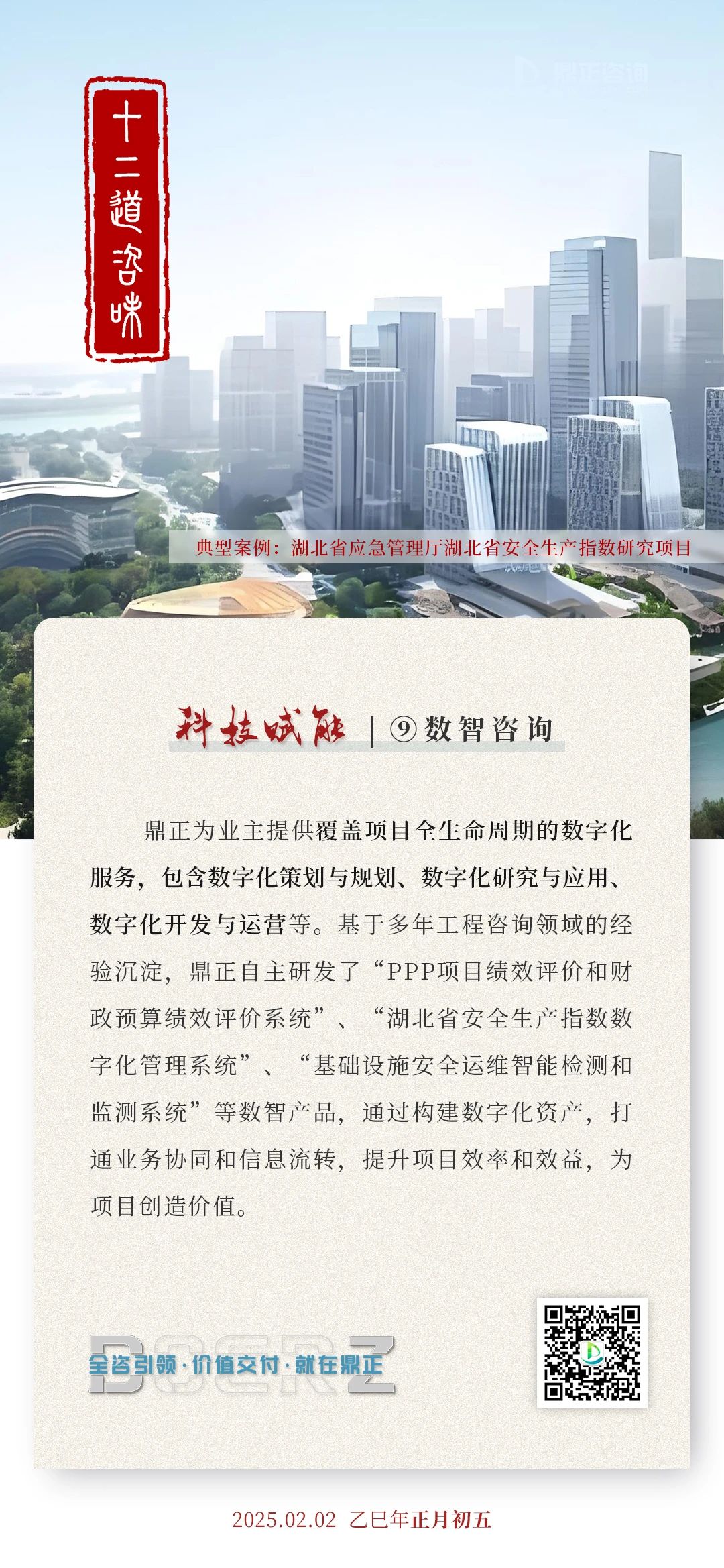 鼎正紧跟数字化发展浪潮,积极推进数字化转型工作。公司围绕数智咨询和智能科技两大主线,充分利用大数据、人工智能、BIM模型等技术,构建了一系列场景化解决方案,如智能化巡检、检测及监测解决方案等,以满足不同场景下的需求。同时,针对传统咨询业务中普遍存在的数据管理低效、标准化流程缺失等痛点问题,鼎正自主研发PP项目绩效评价系统和财政预算绩效评价系统等工具,有效提升了咨询业务的工作效率与质量。