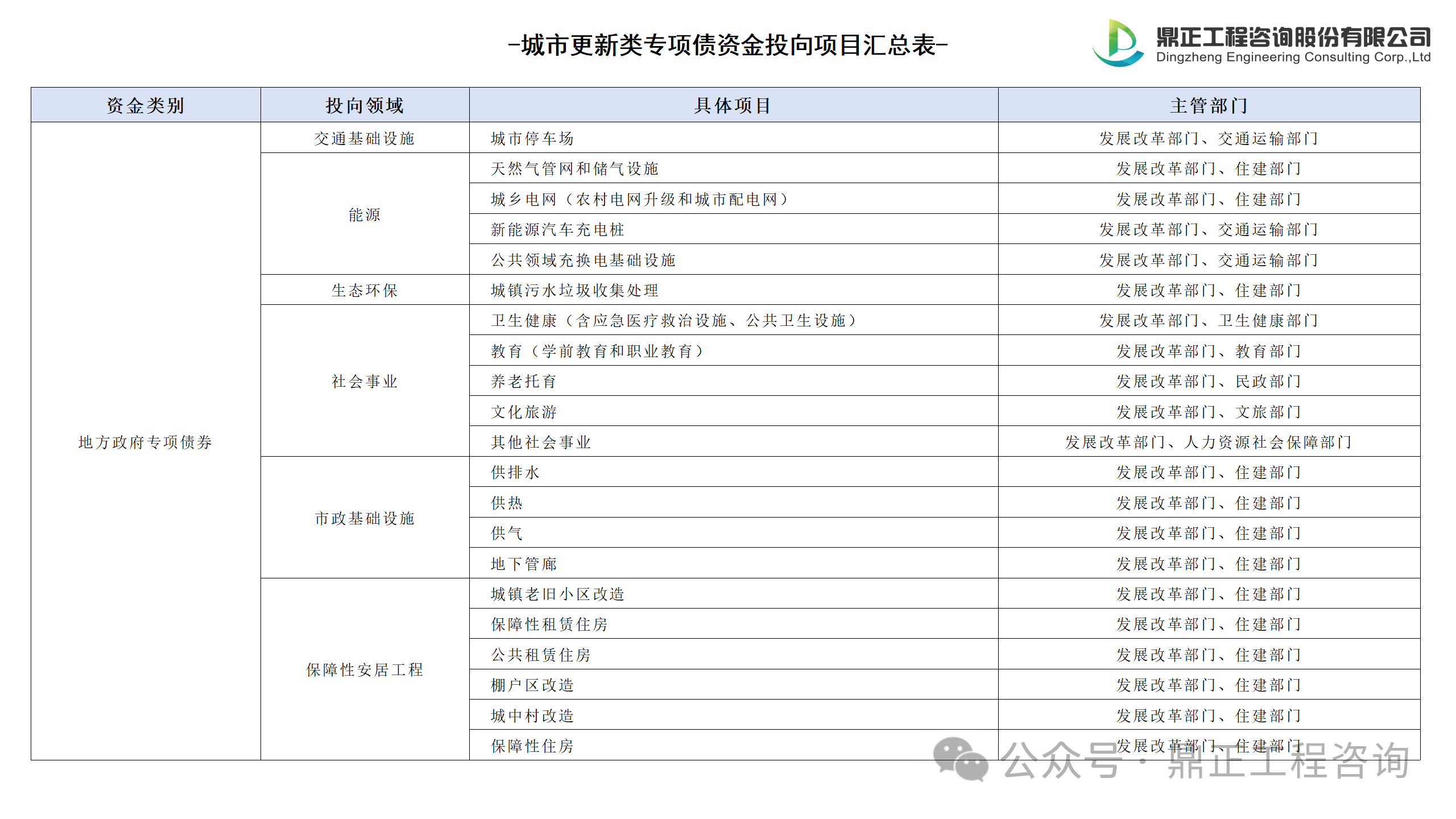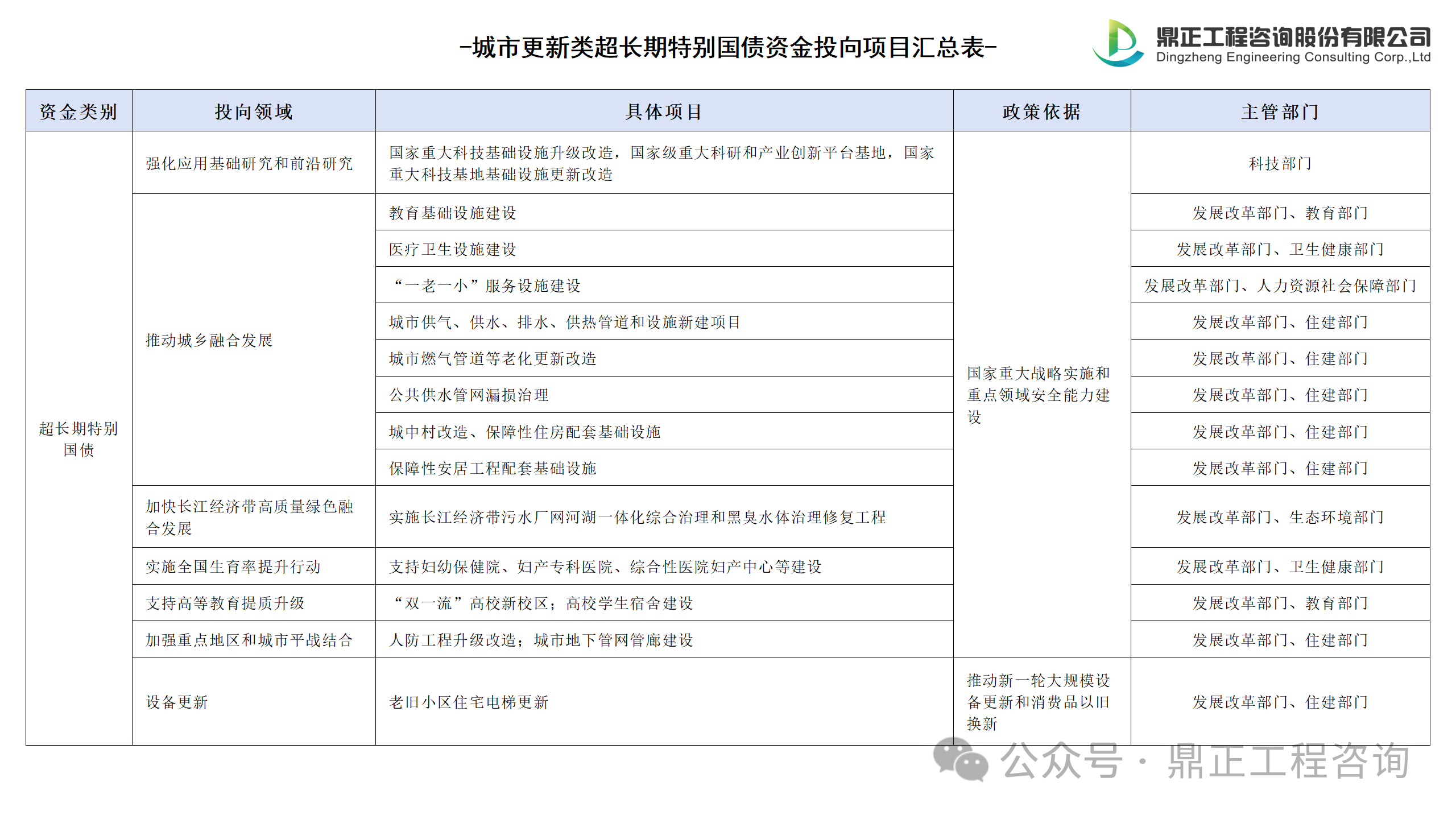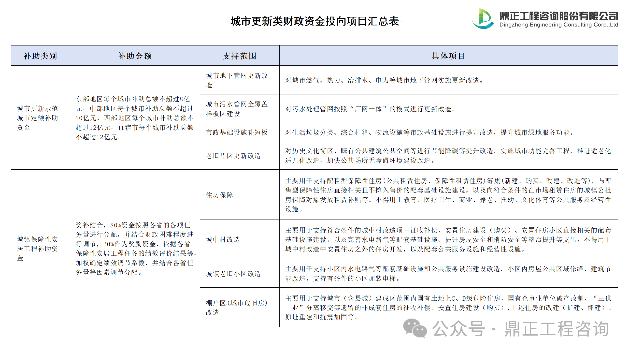 财政部、住房城乡建设部于2024年4月30日联合印发《关于开展城市更新示范工作的通知》,明确示范城市的中央财政补助资金重点支持四大方面:城市地下管网更新改造、城市污水管网全覆盖样板区建设、市政基础设施补短板、老旧片区更新改造四大领域。具体项目上不得重复使用2023年增发国债资金、中央预算内投资、车购税资金、超长期特别国债等其他渠道中央财政资金。