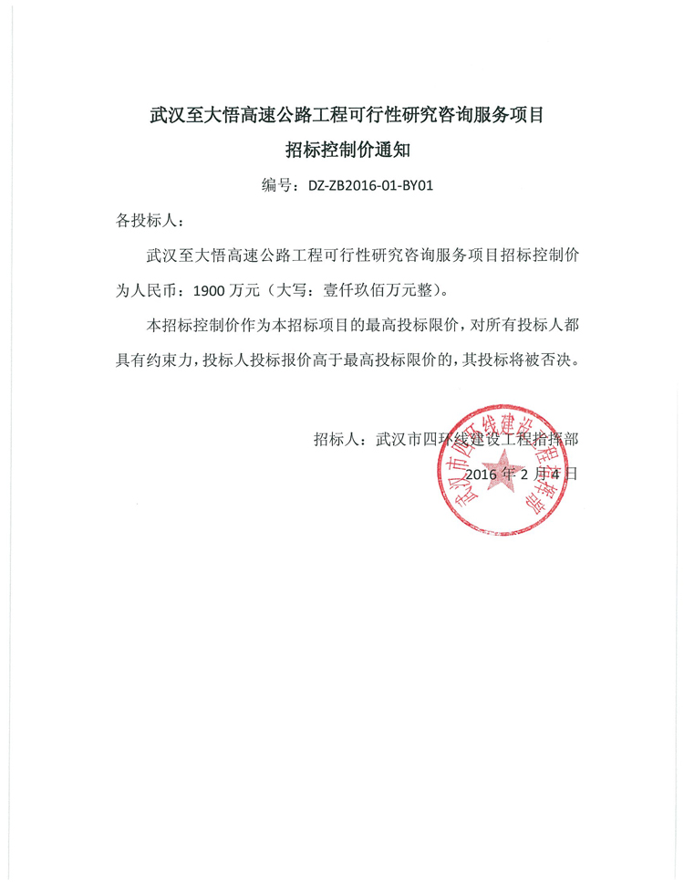 武汉至大悟高速公路工程可行性研究咨询服务项目招标控制价通知