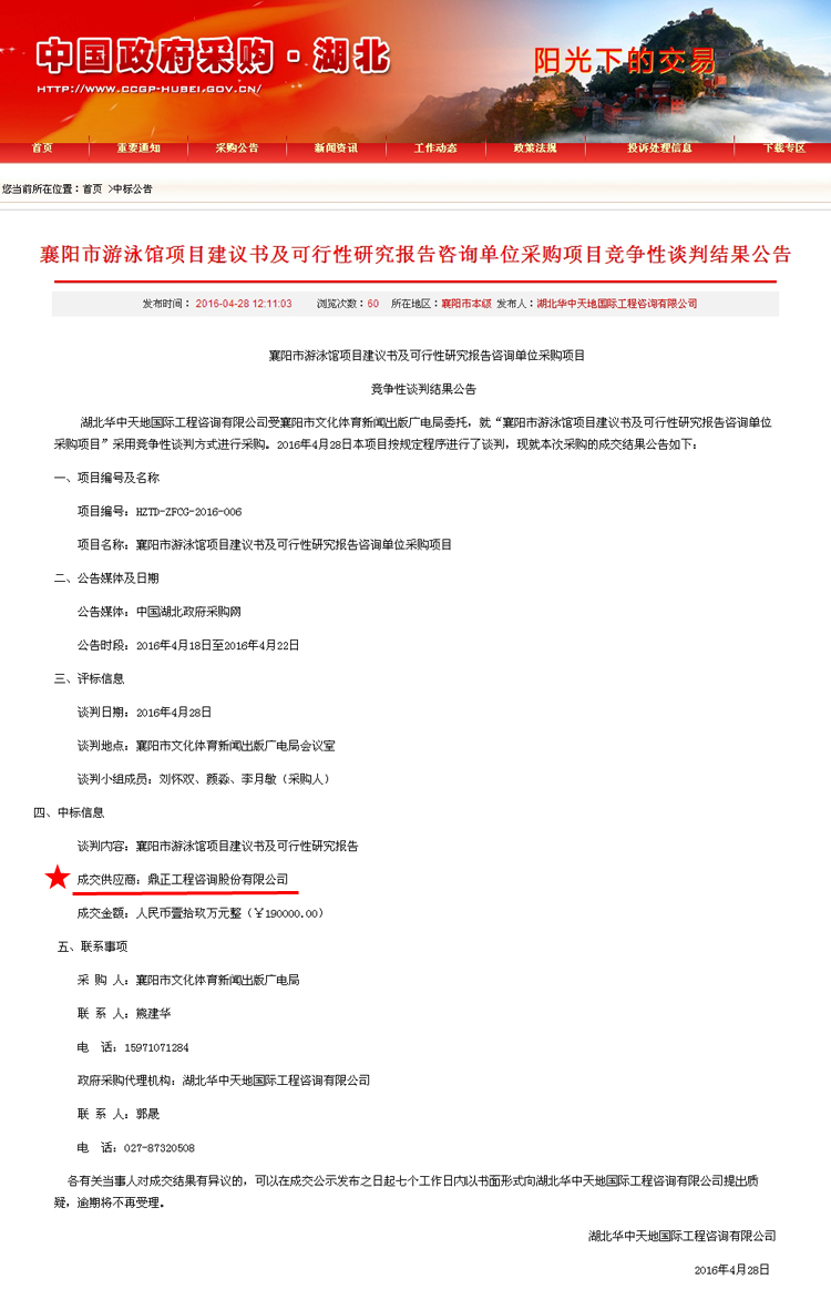 【经营成果】我司中标襄阳市游泳馆项目建议书及可行性研究报告咨询单位采购项目