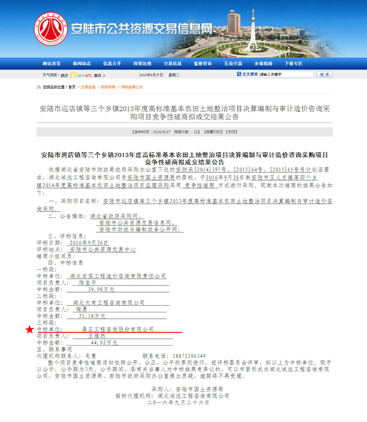 【经营成果】我司中标安陆市巡店镇等三个乡镇2013年度高标准基本农田土地整治项目决算编制与审计造价咨询采购项目