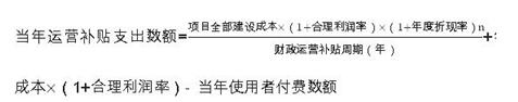 对可行性缺口补助模式的项目,在项目运营补贴期间,政府承担部分直接付费责任。政府每年直接付费数额包括:社会资本方承担的年均建设成本(折算成各年度现值)、年度运营成本和合理利润,再减去每年使用者付费的数额。计算公式为: