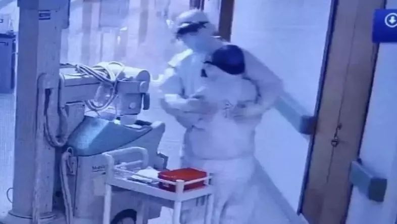 一次性的防护服下,根本认不出防护服里谁是谁。浙江绍兴市人民医院一对多日未见的医生夫妻,在隔离病房前相遇,都没认出对方。