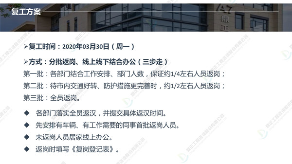 分批返岗、线上线下结合办公,鼎正人的复工准备工作正有序进行。在疫情防控、复工复产两手抓的同时,鼎正咨询将一如既往地为客户提供专业的全过程工程咨询服务。