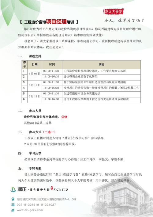 鼎正在6月份组织同事在线学习中价协举办的《工程造价咨询企业项目经理网络直播培训》课程。