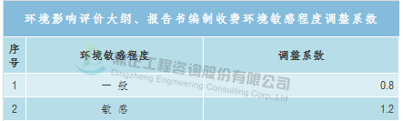 工程复杂程度调整系数:0.8~1.2(工程复杂程度具体调整系数由工程咨询机构与委托单位根据各类工程情况协商确定)。环境影响咨询取费可参考《建设项目环境影响评价收费标准》(计价格〔2002〕125号),以估算投资额为计费基数,根据建设项目不同的性质和内容,采取按估算投资额分档定额方式计费。