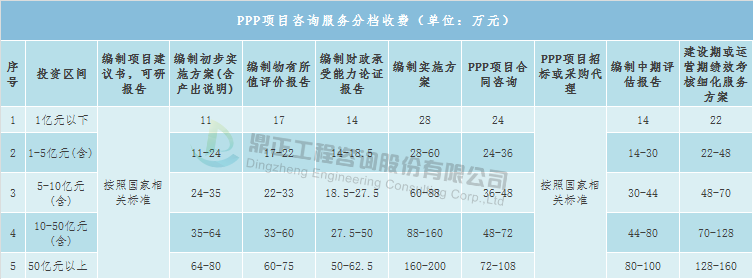 PPP项目咨询服务取费可参考地方收费标准,如广东省工程咨询协会《关于印发PPP项目咨询服务收费参考(试行)的通知》(粤咨协〔2016〕28号)、四川省推进政府和社会资本合作研究会《关于印发四川省PPP项目咨询服务收费标准的通知》(川政资研发〔2018〕2号)。PPP项目主要咨询服务内容包括:项目建议书、可行性研究报告,初步实施方案、物有所值评价报告、财政承受能力论证报告、实施方案,PPP项目合同咨询、项目招标采购代理、中期评估、建设期或运营期绩效考核细化服务方案,建议参照项目投资规模进行收费,具体如下:BIM咨询服务取费可参考上海、浙江、广东、湖南、吉林等地方收费标准,如广东省地方标准——《广东省住房和城乡建设厅关于印发<广东省建筑信息模型(BIM)技术应用费用计列参考依据>的通知》(粤建科〔2018〕136号),具体如下:(1)建筑信息模型(BIM)技术应用费用=计价基础×单价或费率。(2)工业与民用建筑工程,当建筑面积少于2万平方米时,按2万平方米作为计价基础计算建筑信息模型(BIM)技术应用费用;市政道路工程、轨道交通工程、地下综合管廊工程的造价少于1亿元时,按1亿元作为计价基础计算建筑信息模型(BIM)技术应用费用;园林景观工程的造价少于1000万元时,按1000万元作为计价基础计算建筑信息模型(BIM)技术应用费用。(3)建筑信息模型(BIM)技术应用费用不含聘请建筑信息模型(BIM)技术应用的咨询顾问;如需聘请,则可增加10%作为建筑信息模型(BIM)技术应用的咨询顾问费用。(4)因工程复杂程度、规模差异和材料设备标准高低造成应用难易程度不同,建筑信息模型(BIM)技术应用费用可上下浮动20%。