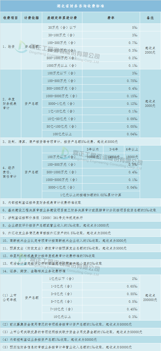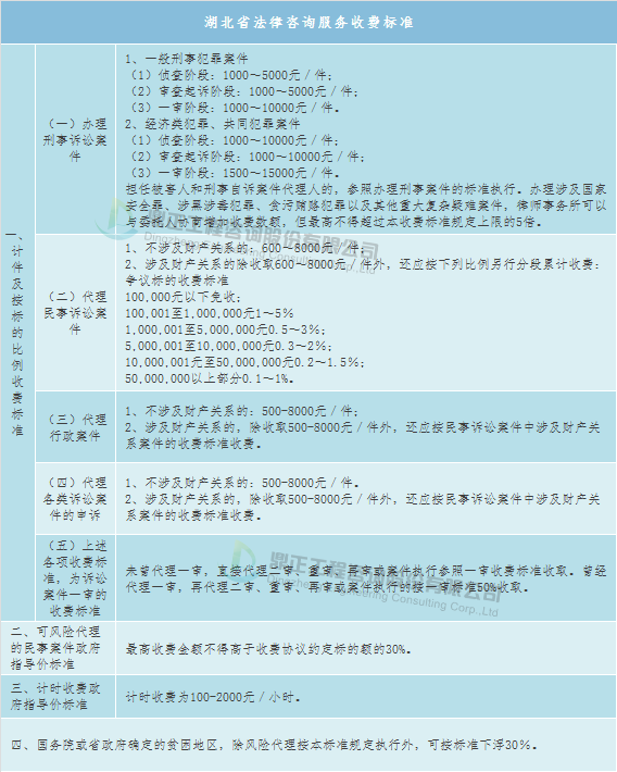 法律咨询服务取费可参考地方收费标准,如湖北省地方标准——《湖北省物价局、湖北省司法厅关于印发<湖北省律师服务收费管理实施办法(暂行)>的通知》(鄂价房服〔2006〕258号),具体如下:会计师事务所服务可参考地方收费标准,如湖北省地方标准——《湖北省物价局省财政厅关于印发<湖北省会计师事务所服务收费管理实施办法>的通知》(鄂价规〔2010〕265号),具体如下:资产评估服务取费标准可参考《国家发展改革委、财政部关于发布<资产评估收费管理办法>的通知(发改价格〔2009〕2914号》)、《关于贯彻实施<资产评估收费管理办法>尽快做好资产评估收费管理工作的通知》(中评协〔2009〕199号)。湖北省资产评估服务也可参考湖北省地方标准——《湖北省物价局湖北省财政厅关于印发<湖北省资产评估服务收费管理实施办法>的通知》(鄂价工服规〔2011〕24号)。单项资产评估收费起收点为2000元。不足2000元按2000元收取。证券、期货、金融相关评估业务、以诉讼、仲裁为目的的评估业务、以无形资产为评估对象的评估业务为特殊评估业务,收费标准可上浮40%,起收点为10000元。