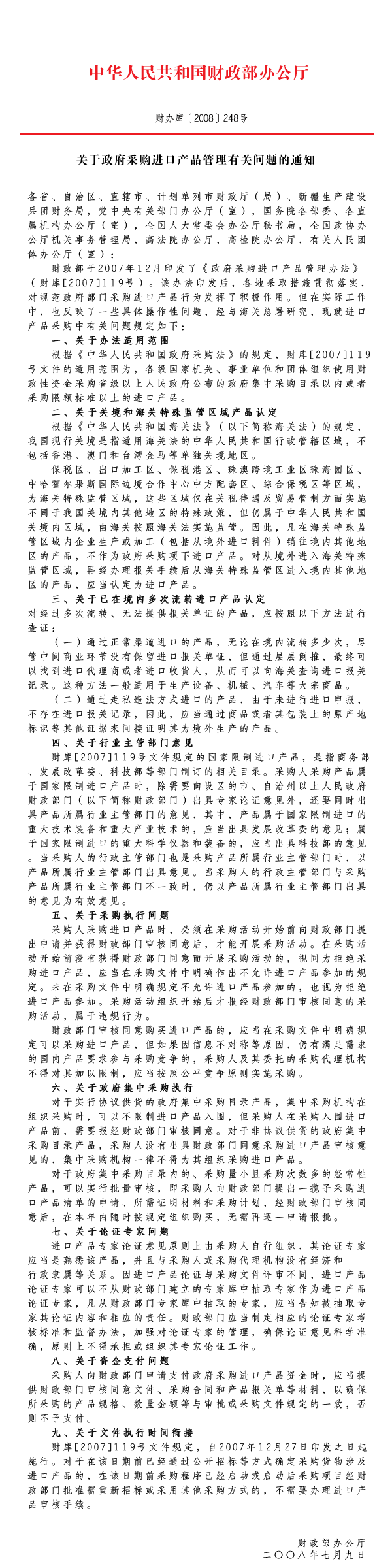 关于政府采购进口产品管理有关问题的通知(财办库〔2008〕248号)